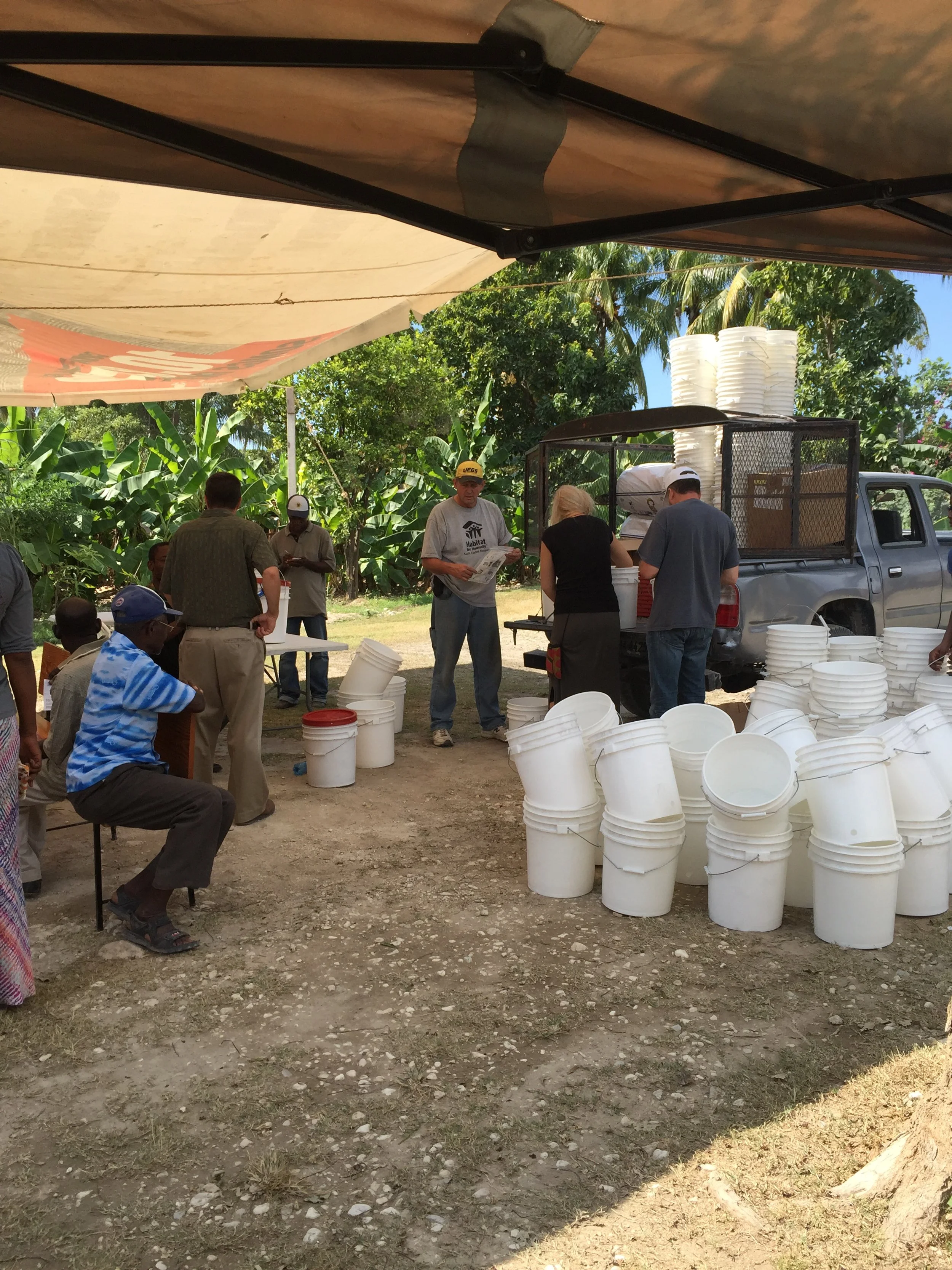 Helping with a clean-water project, giving access to clean water by distributing water-purifying buckets.